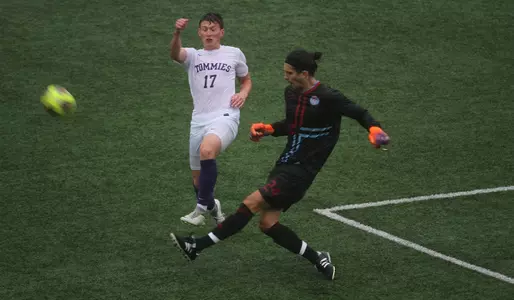 Coach Jon Lowery's Tommies (4-3-3 overall, 3-1 MIAC), who ran their win streak to three, scored a pair of goals from Jonathan Acevedo and Jake Amey 2:09 apart late in the first half, then got an insurance score from Jack Barry midway through the second half.