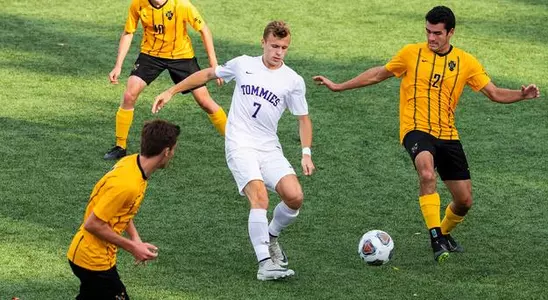 First-place Tommie Men's Soccer recorded a goal in each half and posted another solid defensive day to score a 2-0 home win over Hamline in MIAC play Saturday at South Field.