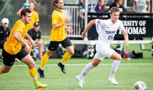 Jake Amey scored in the seventh minute and Tommie Men's Soccer added two late insurance goals 9:24 apart to record a 3-0 road win at Bethel in MIAC play Sunday afternoon in Arden Hills.