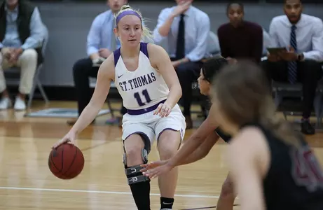 St. Thomas erased a nine-point deficit to start the fourth quarter. The Purple had a 29-18 rebounding edge, hit seven treys, and sank 20-of-25 free throws, including 5-of-6 in the final minute.