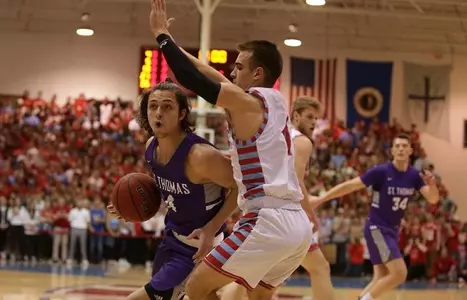 After SJU tied the game in the final 9:00, Zach Theisen converted a four-point play and put the Purple back ahead 60-51. The Johnnies pulled within four points with 1:07 remaining, but the Toms sank 6-of-8 free-throw tries during the final minute.